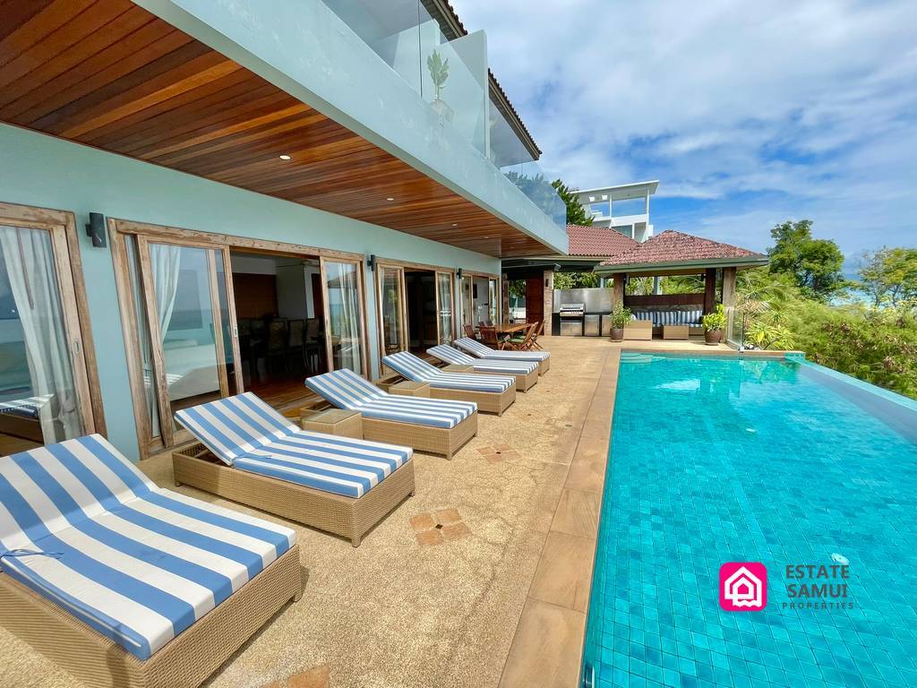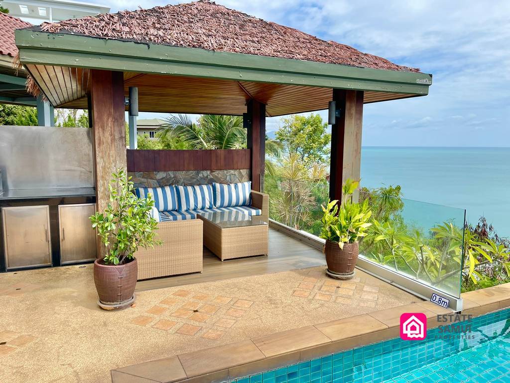 The spacious sun terrace offers sun loungers with lavish soft cushioning and outdoor dining table looking over the 40 sqm infinity swimming pool towards the stunning views. A shady pool-side sala pavilion is the just the place to escape the sun and enjoy the cooling ocean breeze with a chilled refreshment. The built-in gas BBQ is perfect for preparing an evening BBQ and enjoying freshly cooked seafood from the nearby fresh market in Bangrak.