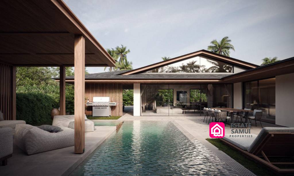 Nestled in the serene Bang Por area, this Luxurious Bang Por Villas residence offers a refined tropical lifestyle just 400 meters from the sea. Designed for comfort and elegance, this Koh Samui villa spans 301.48 sqm on a 421 sqm plot, providing ample space for relaxation and entertainment. The sleek architecture blends seamlessly with the natural surroundings, creating a private oasis with premium amenities.