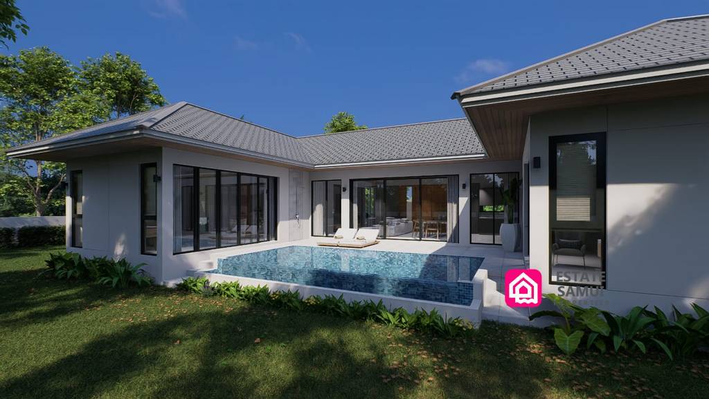 This modern garden pool villa on Koh Samui offers a lifestyle that blends tropical charm with contemporary design. Nestled in a peaceful setting just 500 meters from the beach, the villa combines privacy with convenience. Mountain views enhance the natural beauty of the location, while the landscaped garden creates a private sanctuary for relaxation. With a generous land plot starting from 724 sqm and a built-up area of 272 sqm, the property provides both space and comfort. Fully furnished and move-in ready, it offers the ideal balance between island living and modern convenience.