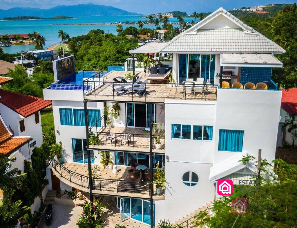 Spacious oceanfront villa for sale in the center of Bangrak town just 50 meters to the sea with exceptional panoramic sea, island, bay and sunset views. Built over 4 floors with 500 sqm of living space, this well-located Koh Samui property hosts 6 bedrooms and 6 bathrooms with the rooftop infinity swimming pool boasting simply irresistible panoramic views.