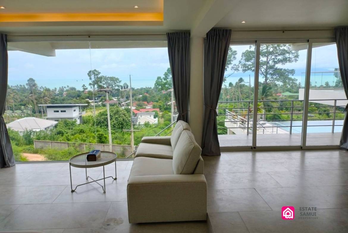 This modern sea view studio apartment in the peaceful Bang Por area of Koh Samui offers a stylish, comfortable living space just 700 meters from the beach. With a generous 53 sqm layout, the apartment is fully furnished with contemporary décor and includes a dining area, kitchenette, lounge, and office space. Whether you’re looking for a holiday getaway or a long-term residence, this apartment has everything you need for comfortable island living.